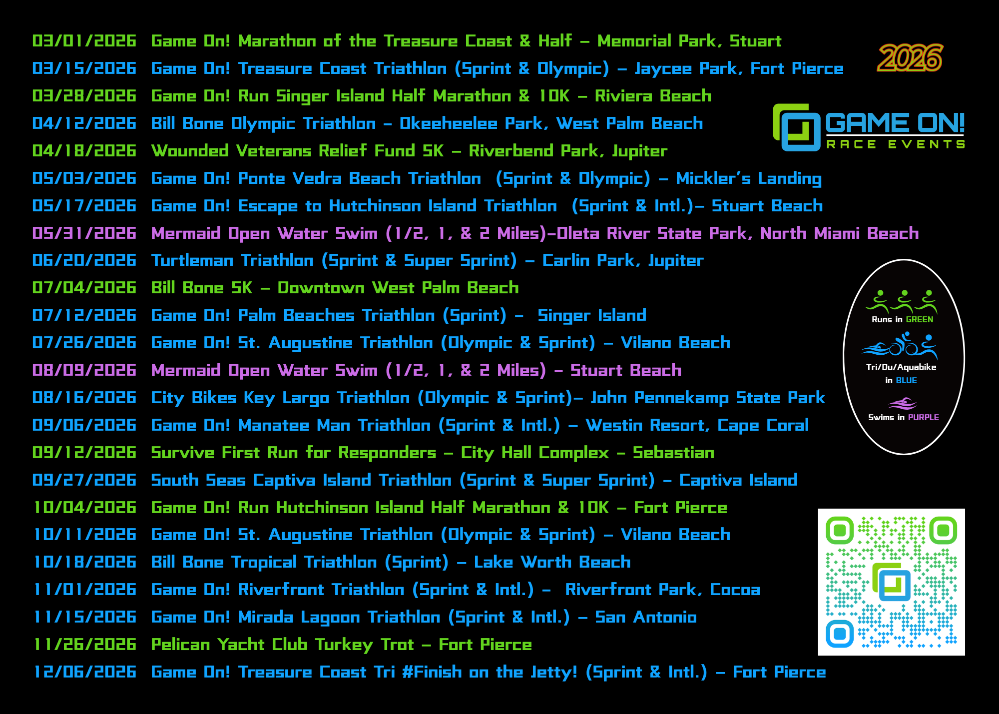 We’ll pause racing briefly in February while we prepare for The Marathon of the Treasure Coast presented by Publix, our largest and most prestigious event, hosted at the newly renovated Memorial Park in downtown Stuart.